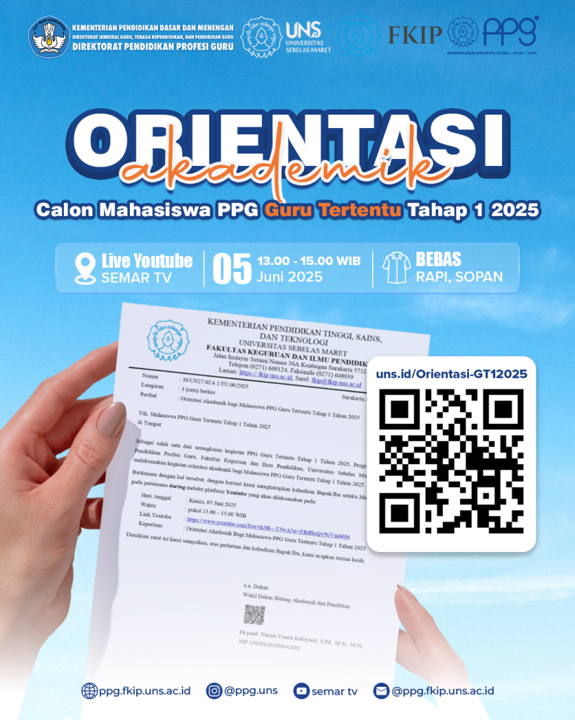 Sebagai salah satu dari serangkaian kegiatan PPG Guru Tertentu Tahap 1 Tahun 2025, Program Studi Pendidikan Profesi Guru, Fakultas Keguruan dan Ilmu Pendidikan, Universitas Sebelas Maret akan melaksanakan kegiatan orientasi akademik bagi Mahasiswa PPG Guru Tertentu Tahap 1 Tahun 2025. Berkenaan dengan hal tersebut, dengan hormat kami mengharapkan kehadiran Bapak/Ibu selaku Mahasiswa pada pertemuan daring melalui platform Youtube yang akan dilaksanakan pada: